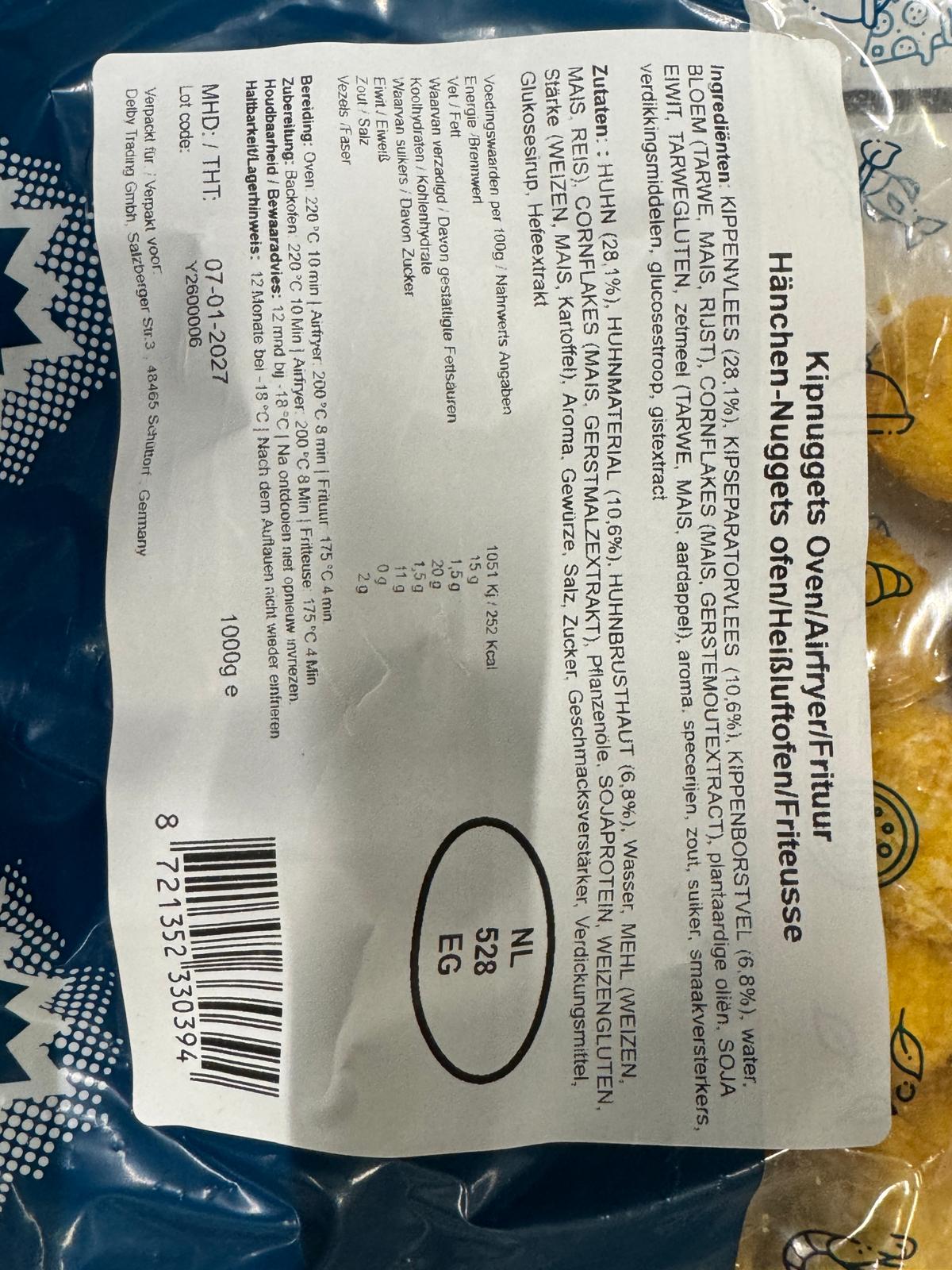 Kippenvlees (28,1%), kipseparatorvlees (10,6%), kippenborstvel (6,8%), water, bloem (TARWE, MAÏS, RIJST), cornflakes (MAÏS, GERSTEMOUTEXTRACT), plantaardige oliën, SOJA-eiwit, TARWEGLUTEN, zetmeel (TARWE, MAÏS, aardappel), aroma, specerijen, zout, suiker, smaakversterkers, verdikkingsmiddelen, glucosestroop, gistextract. |