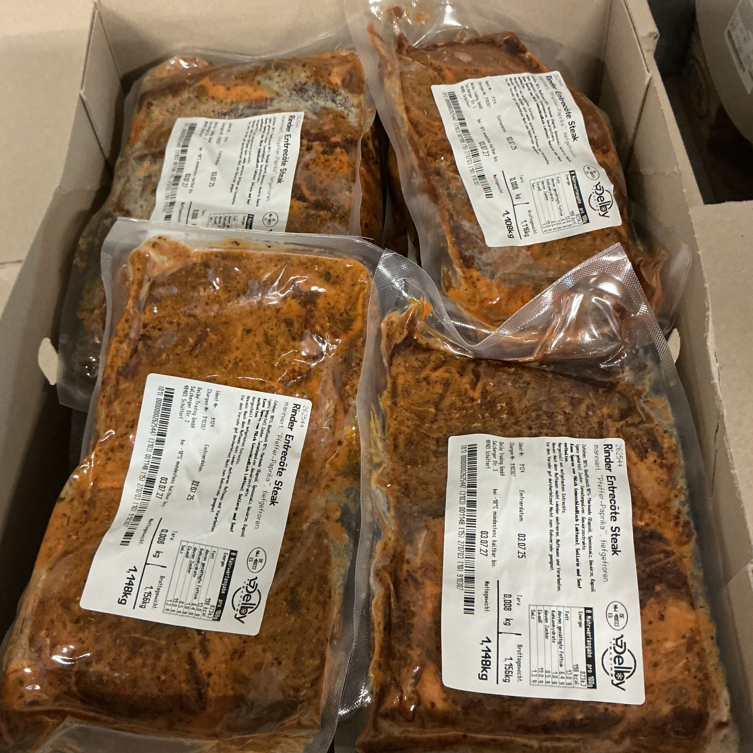 Elke doos bevat circa 8–9 kg aan gemarineerde entrecôtes.